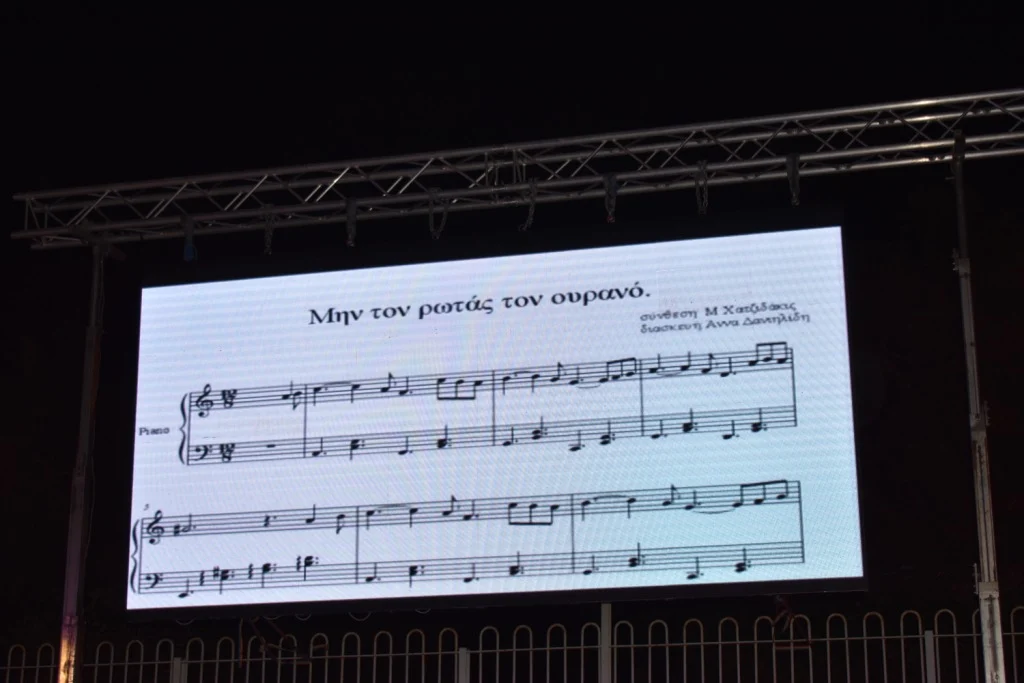 Η εκδήλωση ξεκίνησε με τους «Χαρταετούς» του Μίκη Θεοδωράκη από τις χορωδίες του Δημοτικού Ωδείου, των ΚΑΠΗ Άνω Λιοσίων και Ζεφυρίου και του Μουσικού Οράματος.