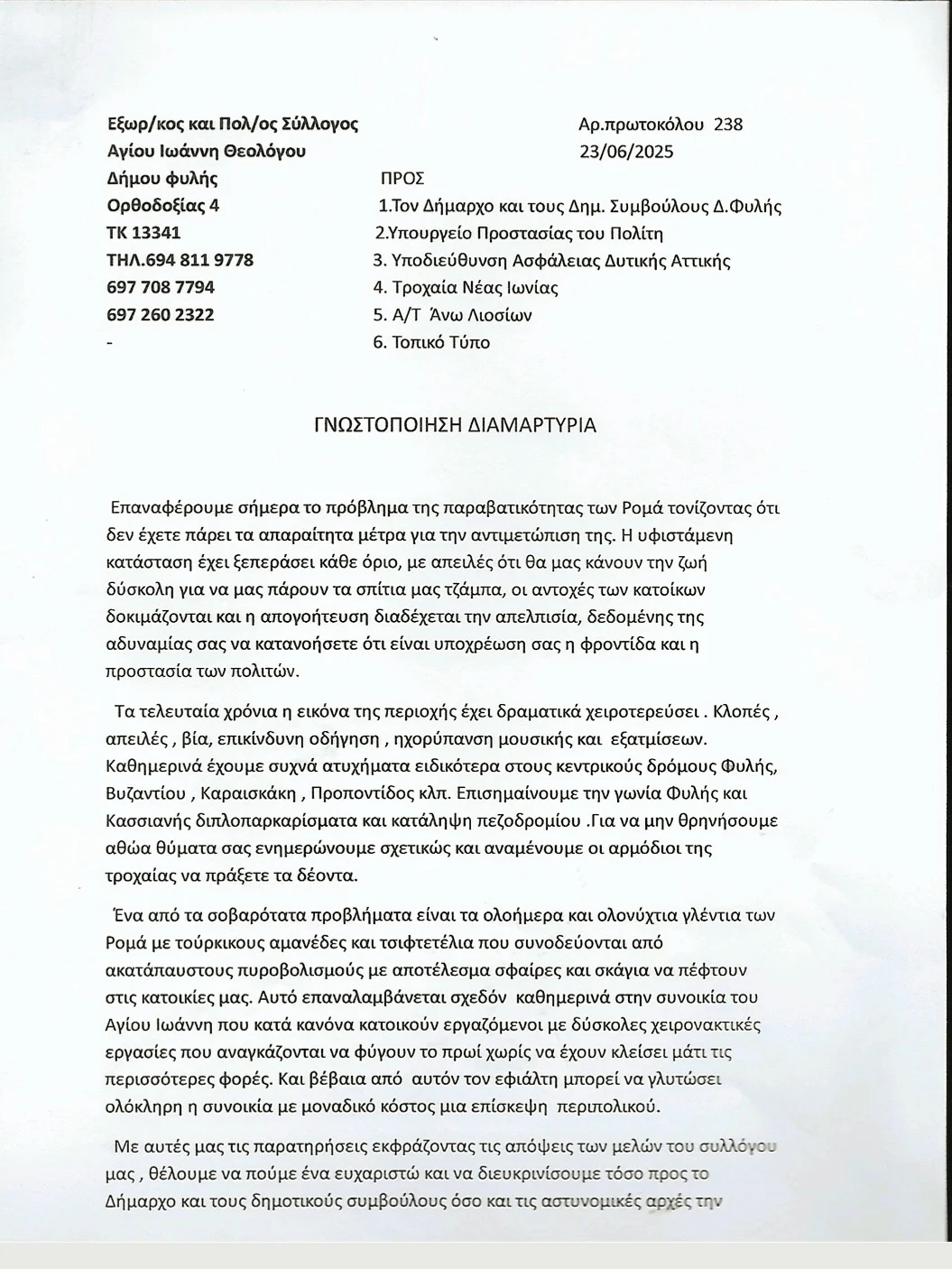 Σε έγγραφη διαμαρτυρία, με συλλογή υπογραφών, προχώρησαν οι κάτοικοι της συνοικίας του Αγίου Ιωάννη Θεολόγου στα Άνω Λιόσια, μέσω του “Εξωραϊστικού και Πολιτιστικού Συλλόγου Αγίου Ιωάννη Θεολόγου Δήμου Φυλής” που τους εκπροσωπεί. Αγανακτισμένοι από την παραβατική συμπεριφορά των Ρομά της περιοχής, οι πολίτες περιγράφουν την “εφιαλτική” καθημερινότητά τους και ζητούν από τις αρμόδιες Αρχές να λάβουν τα μέτρα εκείνα που θα τους διασφαλίσουν την ποιότητα και κυρίως την προστασία της ζωής τους.