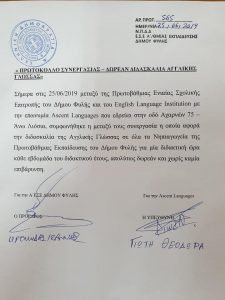 Βάση του συμφώνου συνεργασίας που υπέγραψε ο κ. Κρεμύδας με την υπεύθυνη της Ascent Languages κ. Θεοδώρα Γιώτη και το οποίο ανάρτησε στην προσωπική του σελίδα σε μέσο κοινωνικής δικτύωσης, τα νήπια του Δήμου Φυλής θα επωφελούνται από το νέο διδακτικό έτος (2019 – 2020) μία ώρα εκμάθησης της αγγλικής γλώσσας την εβδομάδα, εντελώς δωρεάν!