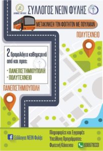 Μετά από περίπου 3 μήνες αναστολής λειτουργίας λόγω της πανδημίας, ξεκινούν και πάλι στις 15 Ιουνίου 2020 τα δρομολόγια του φοιτητικού πούλμαν για Καποδιστριακό Πανεπιστήμιο και Εθνικό Μετσόβιο Πολυτεχνείο.