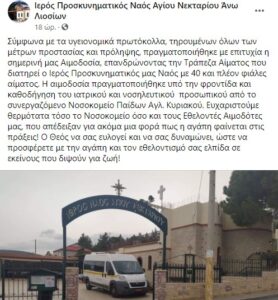 “Σύμφωνα με τα υγειονομικά πρωτόκολλα, τηρουμένων όλων των μέτρων προστασίας και πρόληψης, πραγματοποιήθηκε με επιτυχία η σημερινή μας Αιμοδοσία, επανδρώνοντας την Τράπεζα Αίματος που διατηρεί ο Ιερός Προσκυνηματικός μας Ναός με 40 και πλέον φιάλες αίματος. Η αιμοδοσία πραγματοποιήθηκε υπό την φροντίδα και καθοδήγηση του ιατρικού και νοσηλευτικού προσωπικού από το συνεργαζόμενο Νοσοκομείο Παίδων Αγλ. Κυριακού. Ευχαριστούμε θερμότατα τόσο το Νοσοκομείο όσο και τους Εθελοντές Αιμοδότες μας, που απέδειξαν για ακόμα μια φορά πως η αγάπη φαίνεται στις πράξεις! Ο Θεός να σας ευλογεί και να σας δυναμώνει, ώστε να προσφέρετε με την αγάπη και τον εθελοντισμό σας ελπίδα σε εκείνους που διψούν για ζωή!”