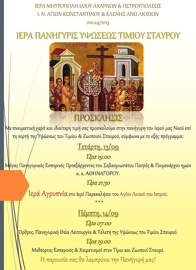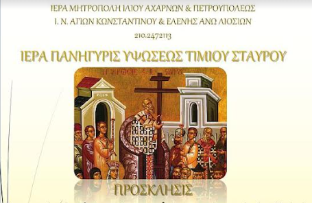 Στις 13 & 14 Σεπτεμβρίου ο εορτασμός του Τίμιου Σταυρού στον Ι. Ν. Αγίων Κωνσταντίνου και Ελένης Άνω Λιοσίων