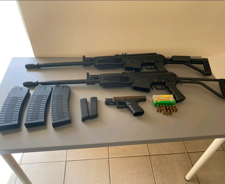 Σε κατ’ οίκον έρευνα που έγινε στο σπίτι του συλληφθέντα Χ.Τ., παρουσία Δικαστικού λειτουργού, εντοπίστηκαν και κατασχέθηκαν, ένα 9άρι πυροβόλο πιστόλι, μαζί με τον γεμιστήρα του που περιείχε 17 φυσίγγια, 50 επιπλέον φυσίγγια, ένας άδειος γεμιστήρας πιστολιού, ενώ σε κρυφό σημείο του υπνοδωματίου ο συλληφθείς είχε κρυμμένες 2 ακόμα καραμπίνες.
