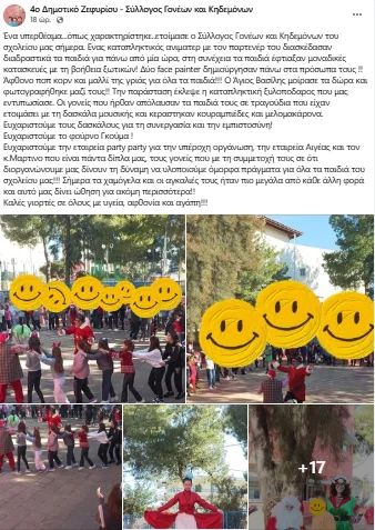 Ακολουθεί η ανάρτηση του Συλλόγου Γονέων και Κηδεμόνων του 4ου Δημοτικού Σχολείου Ζεφυρίου με τις δημόσιες ευχαριστίες σε όσους φρόντισαν για την πραγματοποίηση της ζεστής Χριστουγεννιάτικης εκδήλωσης: