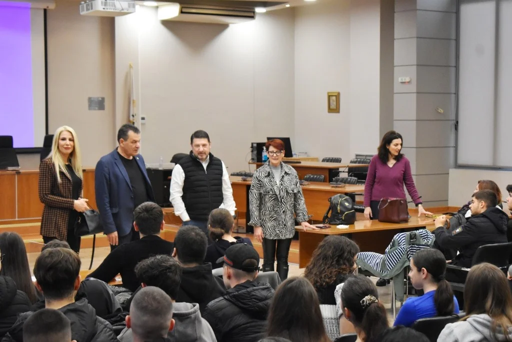 Την ώρα της επίσκεψης στο Δημαρχείο και συγκεκριμένα στην αίθουσα εκδηλώσεων “Μελίνα Μερκούρη” το 1ο ΓΕΛ Άνω Λιοσίων είχε διοργανώσει μια ιδιαίτερα ενδιαφέρουσα Ημερίδα με θέμα: Ασφαλής Περιήγηση στο Διαδίκτυο με ομιλητή τον Ψυχολόγο της Ελληνικής Αστυνομίας στην Δίωξη Ηλεκτρονικού Εγκλήματος, κ. Γεώργιο Νάκο. Ανταποκρινόμενοι λοιπόν στο κάλεσμα της Διευθύντριας του Σχολείου κας Ελένης Καμπόλη η οποία και τους καλωσόρισε εκ μέρους των εκπαιδευτικών και των μαθητών, Περιφερειάρχης, Δήμαρχος και Αντιπεριφερειάρχης Δυτικής Αττικής βρέθηκαν ανάμεσα σε μαθητές και καθηγητές κι είχαν μια ολιγόλεπτη αλλά πολύ χρήσιμη συνομιλία.