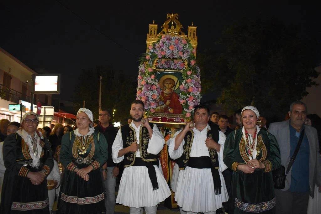 Την εικόνα πλαισίωσαν και στο φετινό εορτασμό μέλη του συλλόγου Βορειοηπειρωτών Φυλής με τον πρόεδρό τους Σπύρο Κόκκαλη, φορώντας παραδοσιακές φορεσιές ενώ στη διάρκεια της διαδρομής νεαρά κορίτσια από την ενορία έραιναν την εικόνα του Αγίου με ροδοπέταλα. Η διαδρομή που ακολούθησε η πομπή ξεκίνησε από τον Ιερό Ναό, κατευθύνθηκε στη Λεωφόρο Μ. Αλεξάνδρου και μέσω των οδών Ικτίνου, Ηρακλέους, Λυσιμάχου, Αισχίνου και Πλάτωνος κατέληξε στην πίσω πλευρά του Ιερού Ναού.